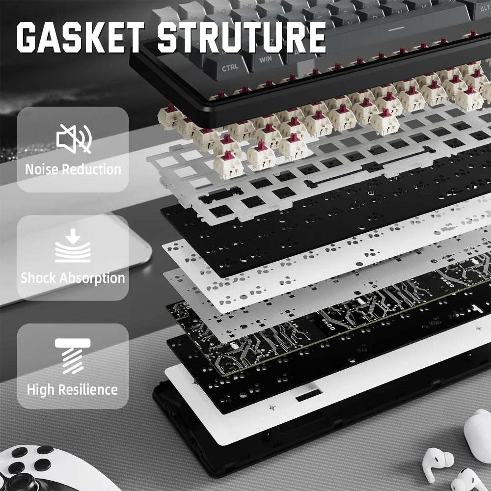 • Bluetooth & 2.4G Wireless & Type -C Wired• 60% ANSI Layout & Upgraded Gasket-Mount• Hot-swap, Compatible with 3/5pin Switches• Pre-Lubed Custom Strawberry Switch• 5 Types of Foams--PORON Foam/ IXPE Switch Pad/PET Noise Cancellation Pad/PORON Dampening Pad/PET Pad• 1.2mm Single Key Slotted PCB• 16.8 Million RGB & Full key Anti-Ghosting• 3000mAh Battery & Smart Power Saving• Double Shot PBT Keycaps• Driver Support